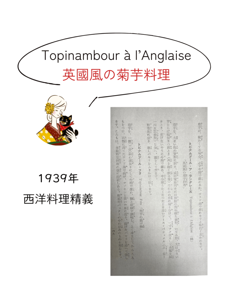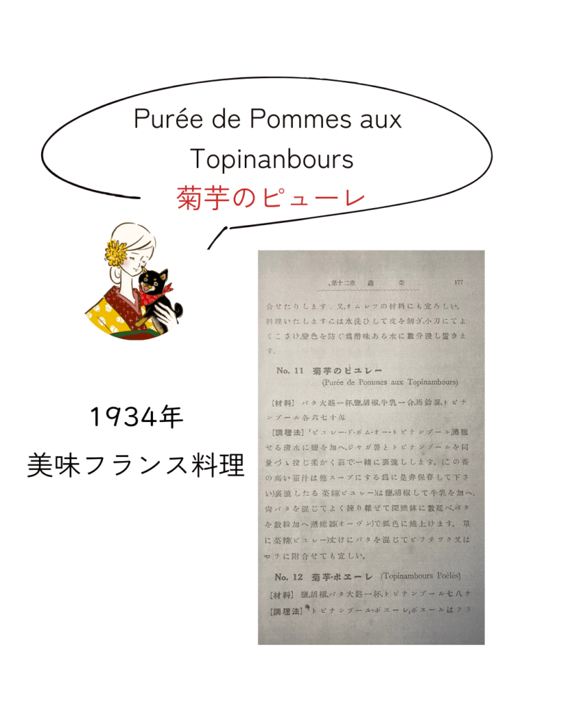 【西洋料理精義】著者:手塚 かね子発行:昭和14年(1939年)8月25日 著者は日本女子大學教授菊芋を使った西洋料理のレシピは4品✨分けて引用していきます🧐 (引用箇所:P148~149) トピナンブール・ソテーTop […]