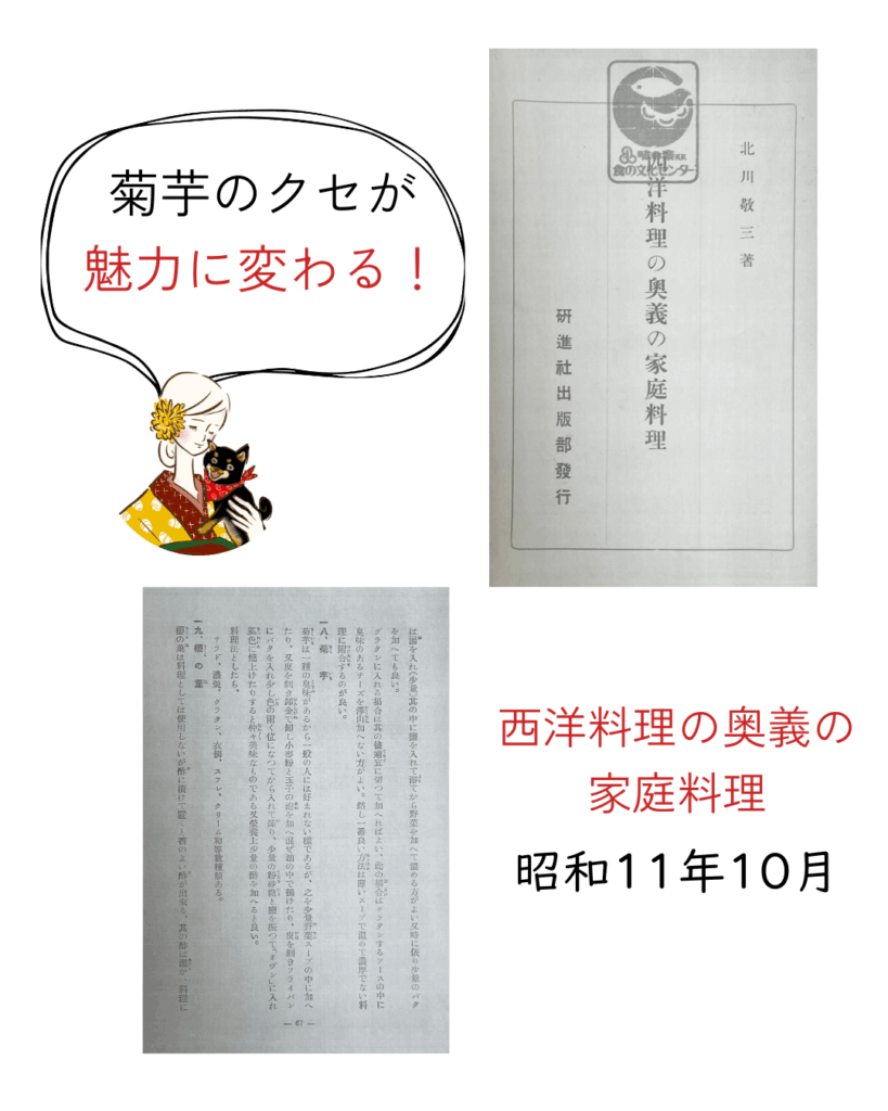 【西洋料理の奥義の家庭料理】著作兼発行者:北川 敬三発行:昭和11年(1936年)10月10日 昭和にも続く西洋の知恵が記載された書籍菊芋のクセも書かれており、それを魅力に変えてくれる西洋料理の奥義🍽️✨菊芋は生でも揚げ […]