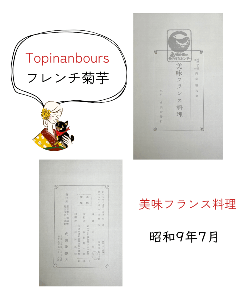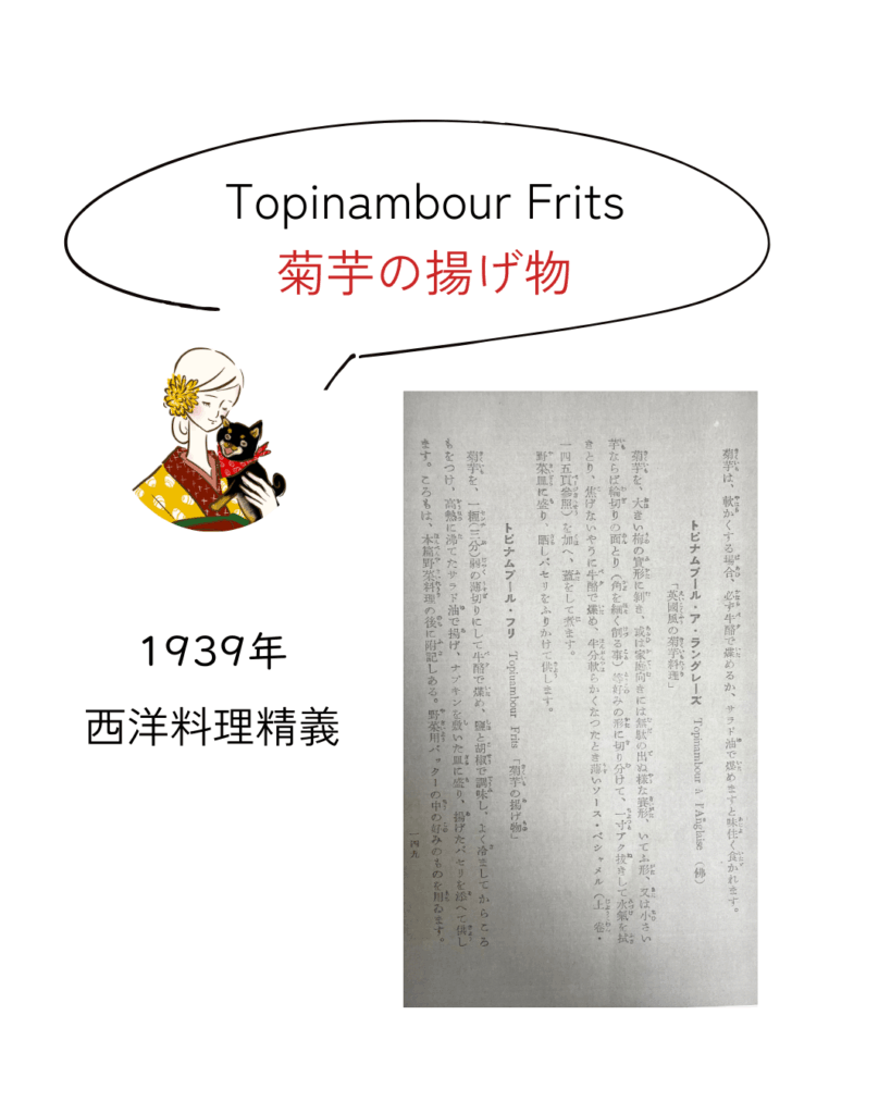 【西洋料理精義】著者:手塚 かね子発行:昭和14年(1939年)8月25日 (引用箇所:P149~P150) トピナンブール・フリTopinambour Frits「菊芋の揚げ物」 菊芋を、一糎(三分)弱の薄切りにして牛 […]