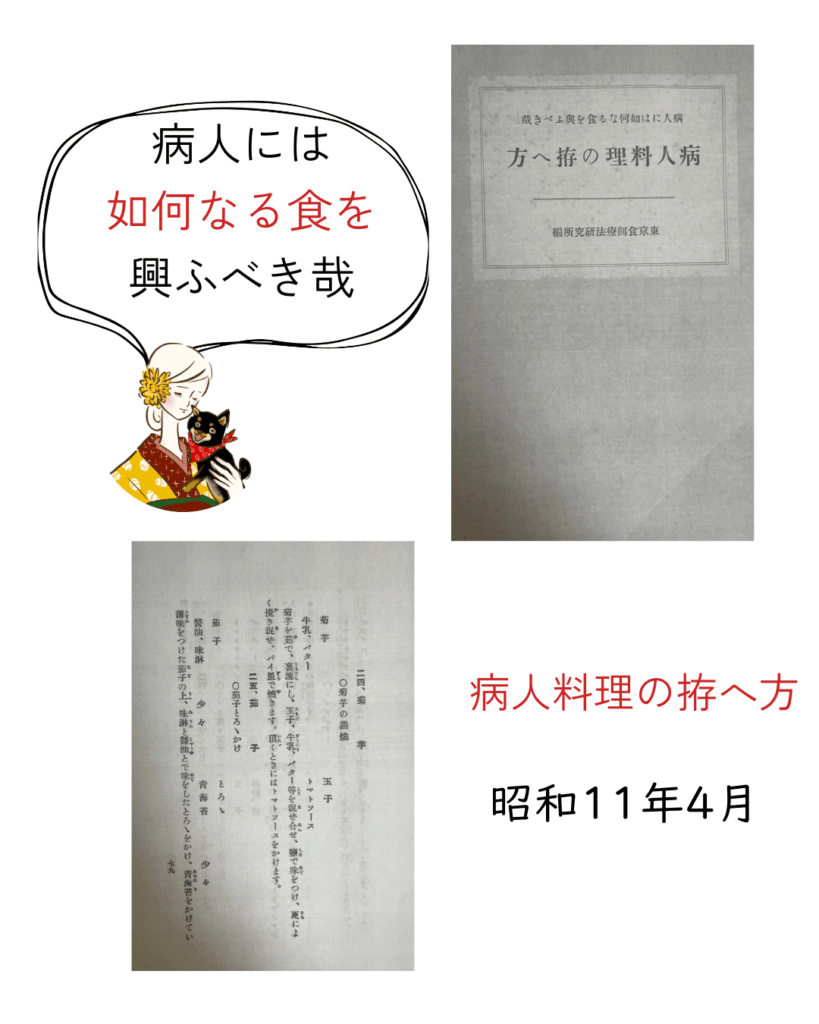 【病人料理の拵へ方】著者:東京食餌療養研究所発行:昭和11年(1936年)4月20日 「病人には如何なる食を興ふべき哉」書籍の表紙に記載された文言病人には、どんな食べ物を与えるべきであろうかと🧐 数あるページの中、貴重な […]
