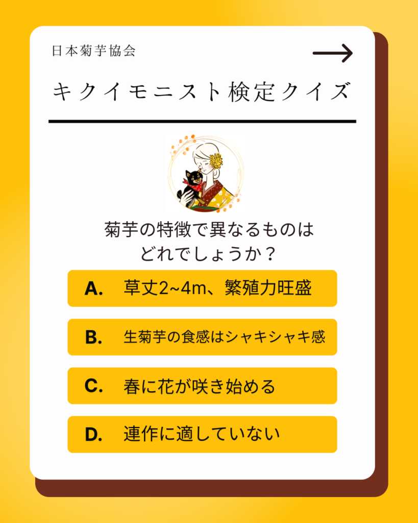 菊芋コラム 2026年04月03日 検定クイズその⑩ キクイモのことをどれだけ知っているかを試すクイズ形式の検定です🧐 栄養や健康効果、食べ方の知識まで、キクイモマスターへの道を楽しみながら学べます。 全部で11問あります。練習用に順次投稿いたしますのでご興味のあられる方は […] [続きを読む]