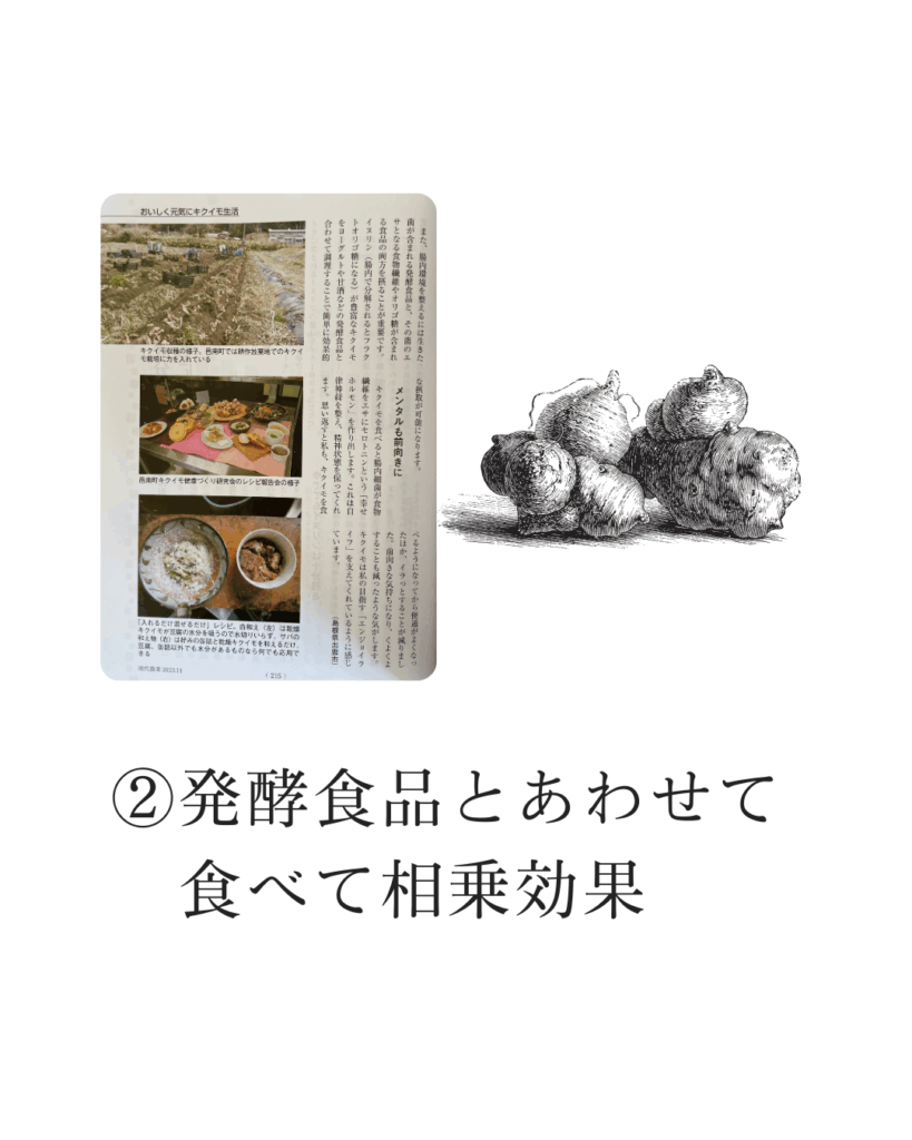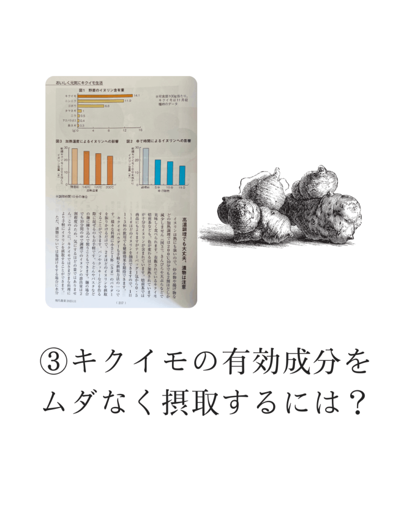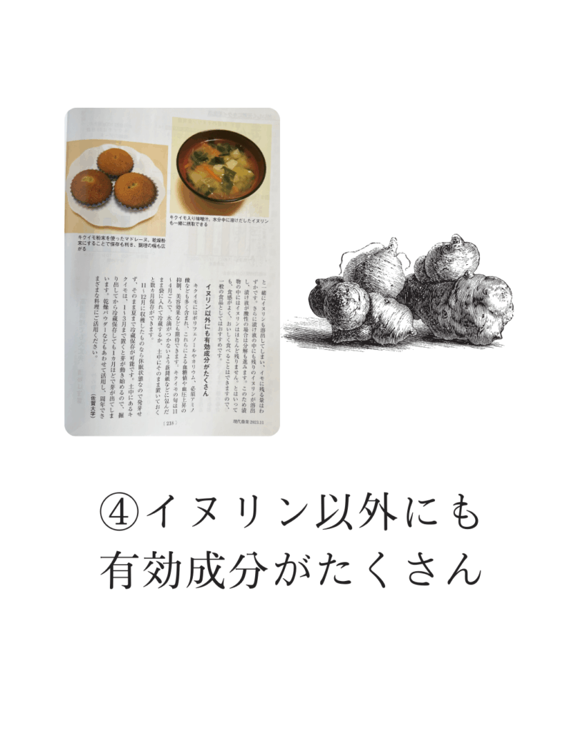 【現代農業】2023年11月号 引用箇所(P218)「イヌリン以外にも有効成分がたくさん」 キクイモにはポリフェノールやカリウム、必須アミノ酸なども多く含まれ、これらによる血糖値や血圧上昇の抑制、美容効果なども期待できま […]
