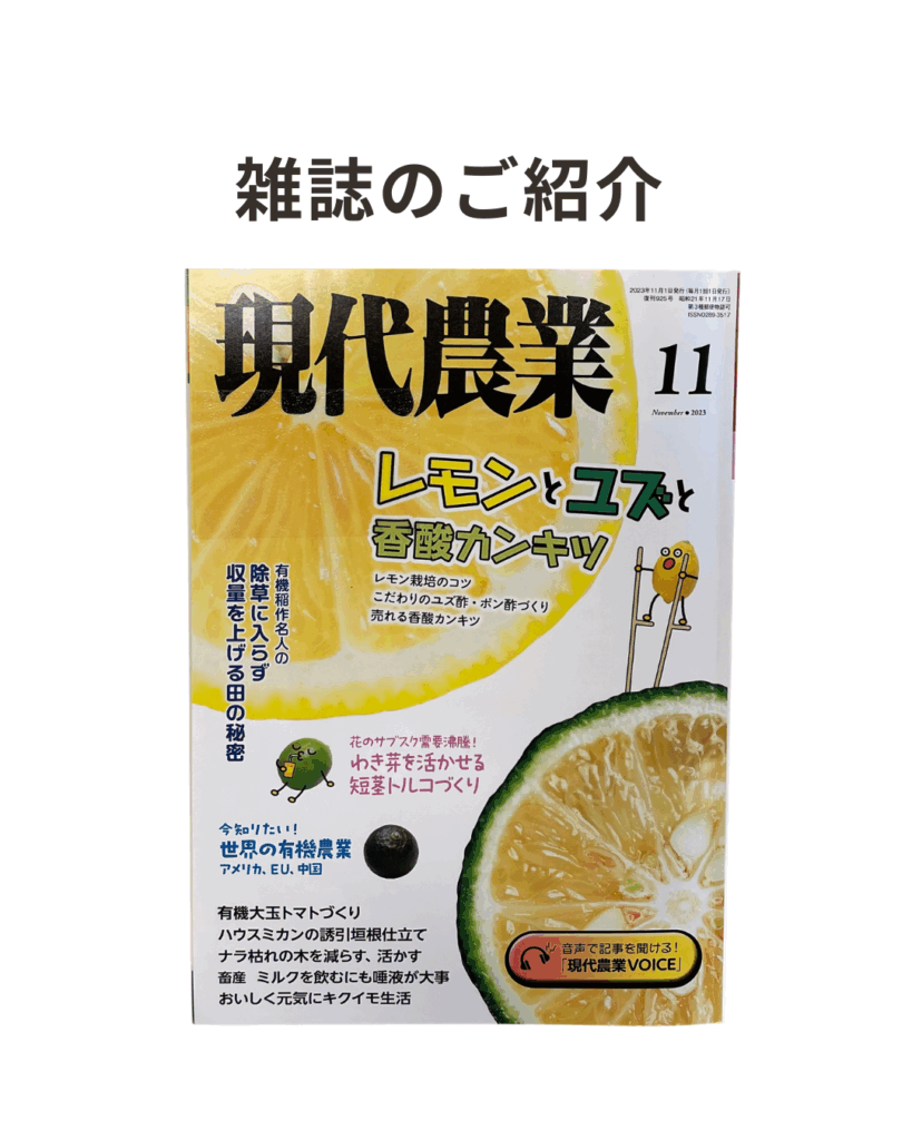 雑誌のご紹介【現代農業】2023年11月号 引用箇所(P219~P220)愛知県在住・加藤明様の記事📚 「高温多湿で白絹病が発生」 私は2010年に定年退職し、年金をあてにしない健康生活をするために、1日3000円の売り […]