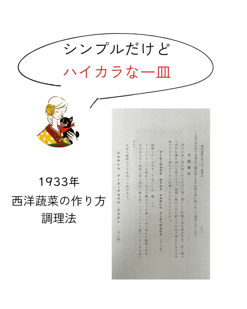【西洋蔬菜の作り方・調理法】著者:篠原 徳之助、金森 越発行:昭和8年(1933年)10月5日(成美堂) (引用箇所:P262~P263) レシピ(五人前)【エルサレム アーティチヨウク グラタン】 材料=アーティチョー […]